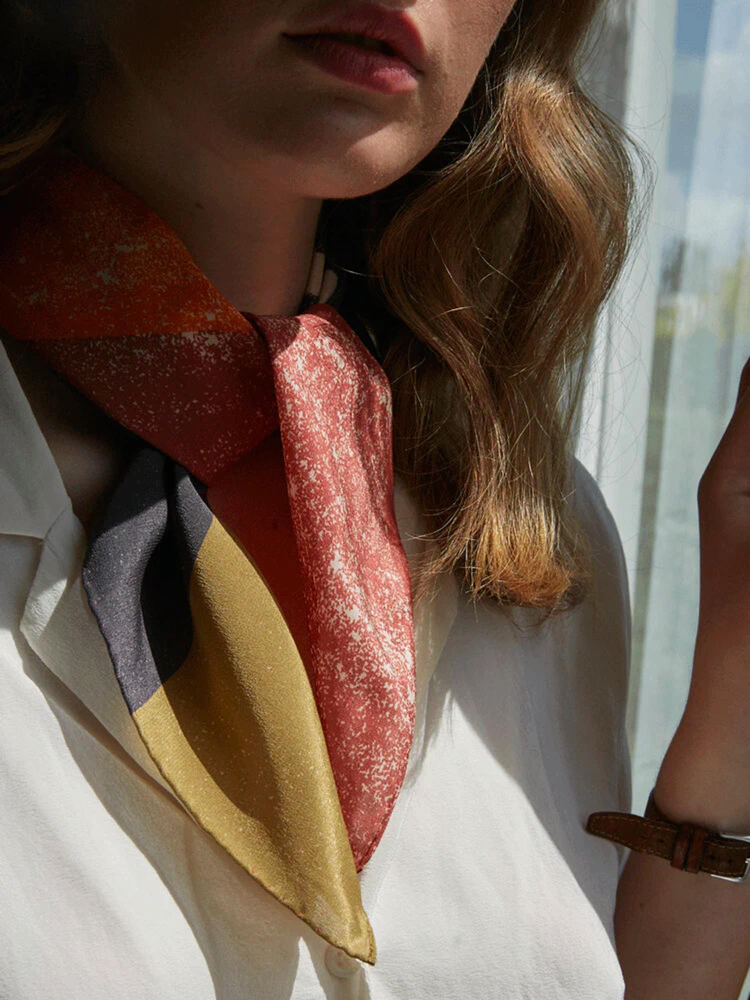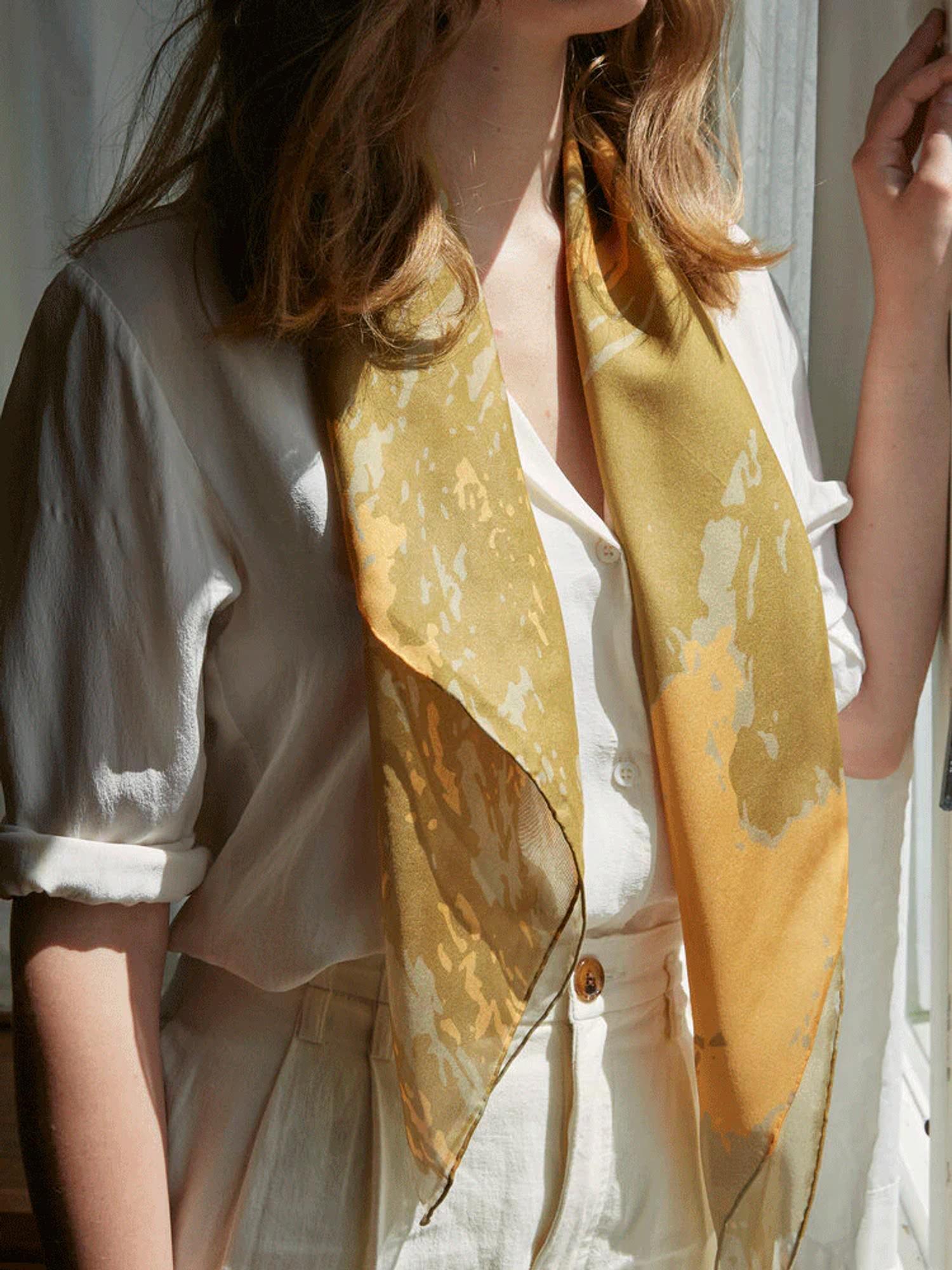 The collection of scarves are inspired by observations of disintegration in our physical and emotional surroundings but also inspired by the beauty still visible and inherent in our world. Shop, here.