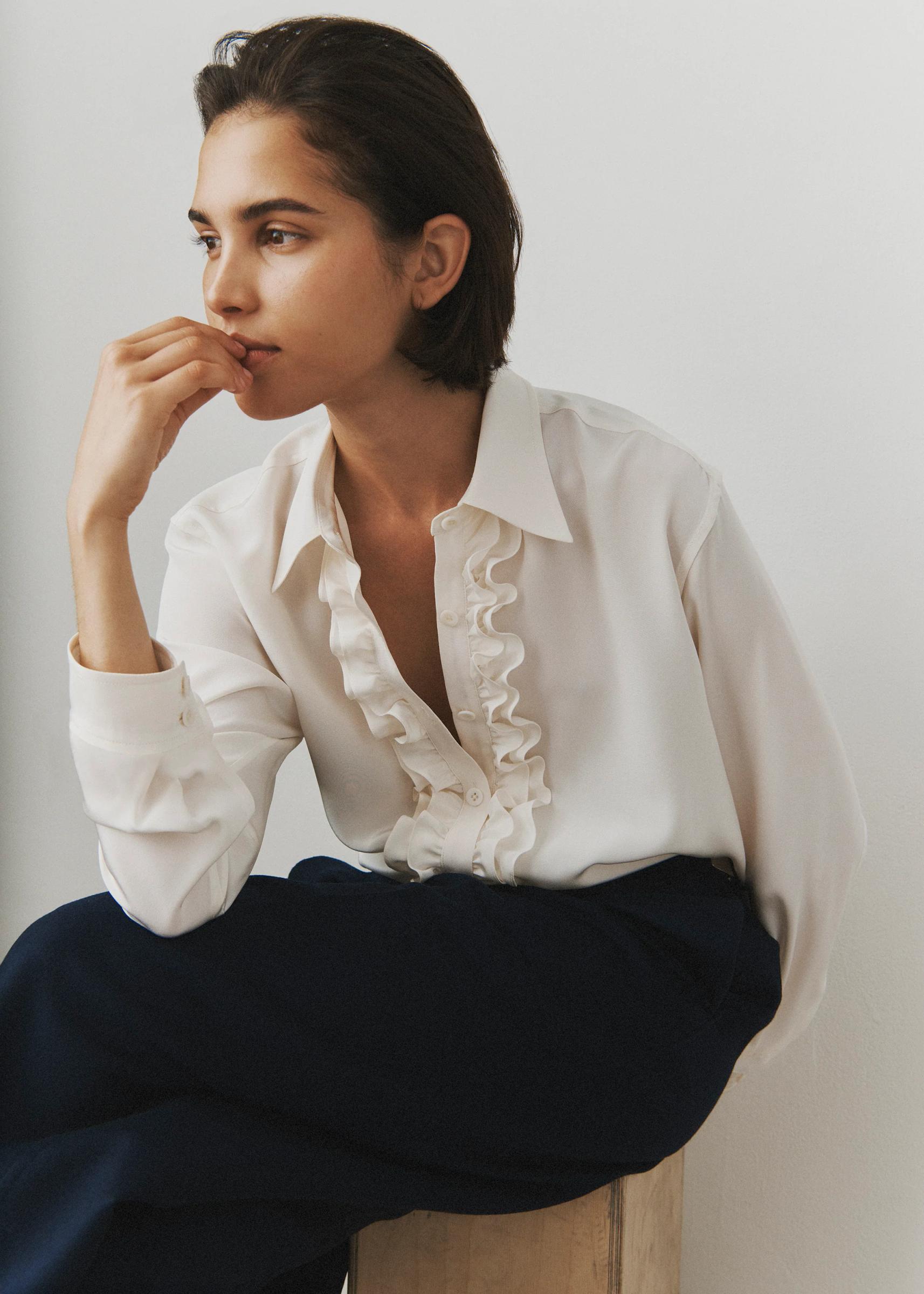 Romantic ruffles sit alongside mother-of-pearl buttons amongst a luxurious creme silk. Slightly cropped for versatility, with enough allowance for a tuck into high-waisted trousers. [Marie Silk Blouse Creme, $1275, as seen on lead image].