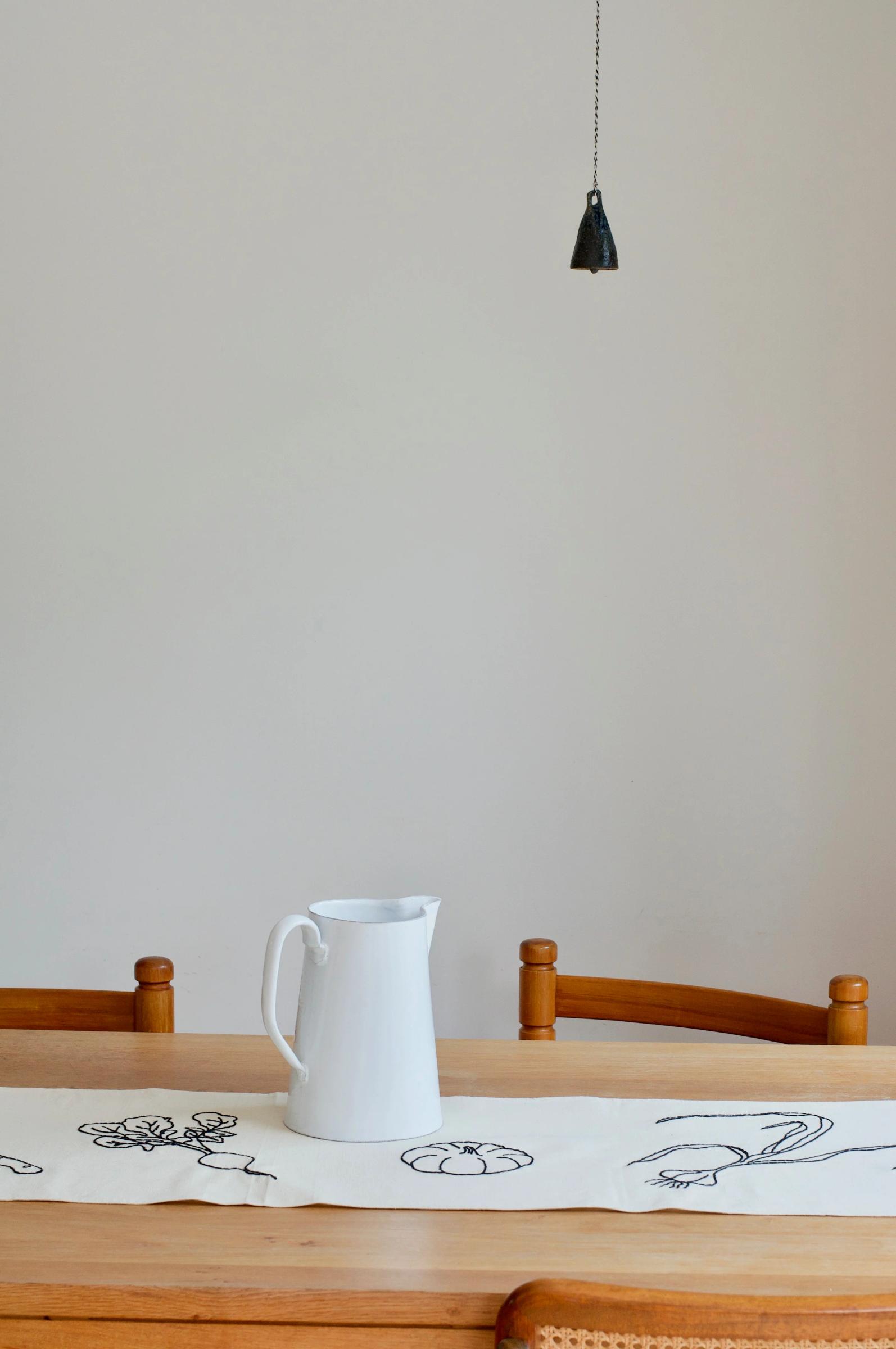 With black cotton thread, Table du Potager (a full sized tablecloth) hosts a poetic embroidered story: four plates, one cabbage, one loaf of bread, one butterfly, one bottle of wine and one snail. Chemin de Potager (a table runner) features one fresh garlic, one butternut squash, one turnip, one knife and two pears.